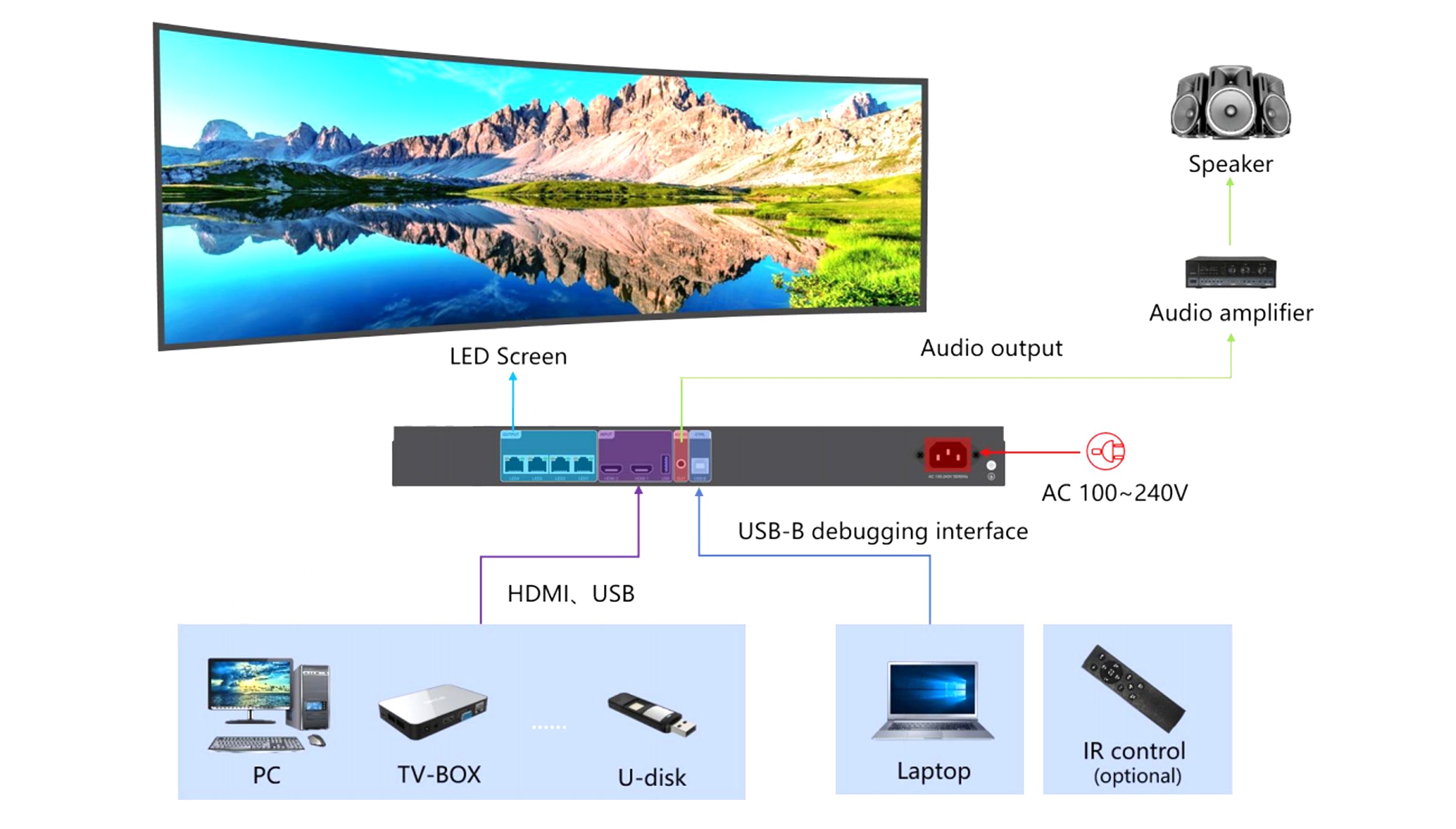 1 channel USB input supports direct playback of videos and pictures in various mainstream formats in the root directory of the USB flash drive, and supports up to 1920×1080@30Hz high-definition video playback;